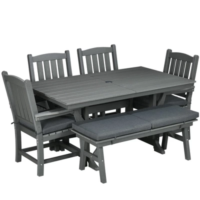 Want a place to put on backyard barbeques and cozy campfires? Like to read in the breeze? Need a table and chairs? Outsunny has an outdoor dining table and chairs set to help you put on the picnic of your dreams. Keep comfy, sitting on a cushioned surface. Featuring four chairs and a dining bench with a farmhouse look, our HDPE furniture is outdoor ready. The table features a central umbrella hole for the umbrella of your choice. Put some party into your patio with Outsunny.