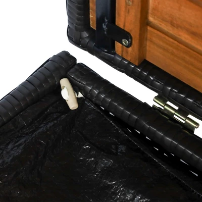 - OUTDOOR READY MATERIALS: This wicker storage bench is made of hand-woven PE plastic rattan that offers classic wicker style with superior durability against water and weather. It’s reinforced with a heavy-duty powder-coated steel frame to hold more weight without warping. The interior storage is protected with a water-resistant polyester bag, and the top of the seat is made of oil-treated wood, so your storage is outdoor-ready.